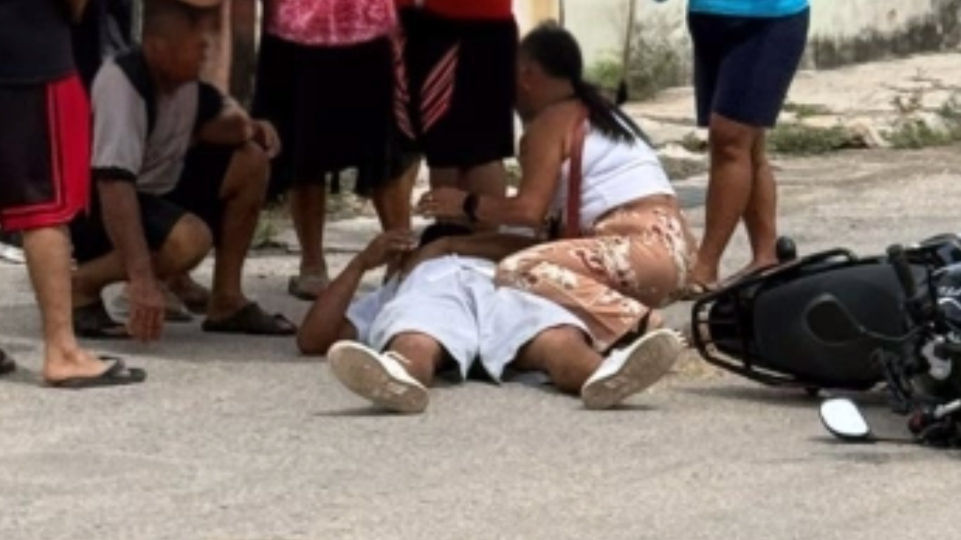 DZIDZANTÚN, Yucatán, lunes 06/10/2025.- El motociclista M. Estrada (a) “Cahuito” resultó con una posible fractura de hombro la tarde de ayer domingo luego que atropelló a un perro que se le atravesó al paso intempestivamente, cuando circulaba sobre la calle la 19 con 14.
