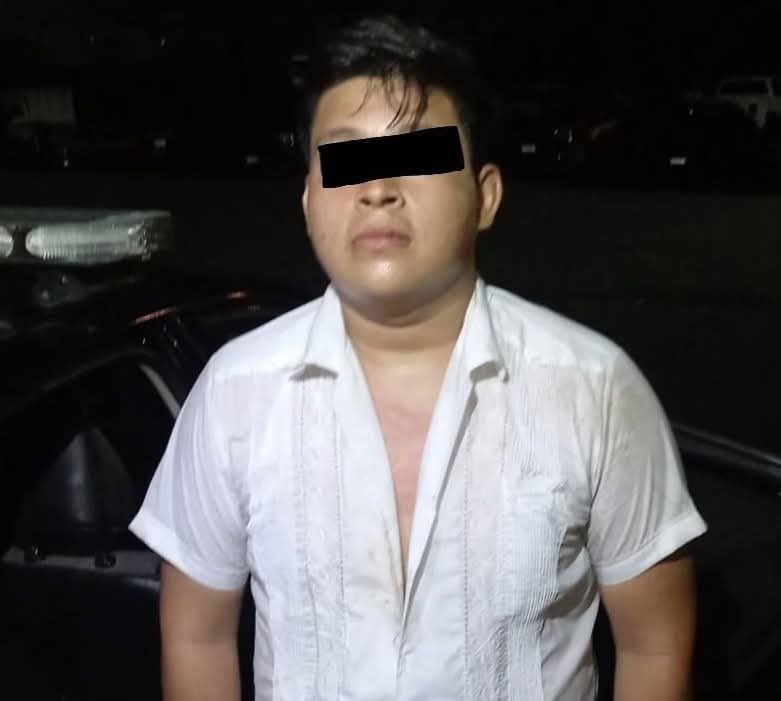 DZIDZANTÚN Yucatán, lunes 27/10/2025.- La policía detuvo al joven Krishna A.Z.V., de 22 años de edad, hijo de un comerciante de Dzidzantún, luego que robó prendas de vestir en una tienda departamental en Plaza The Harbor, y chocó contra un poste en la colonia El Rosario Chuburná cuando se daba a la fuga.