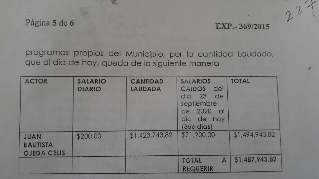 En una resolución plasmada en un memorial se fijó para llevar a cabo el día 15 de octubre de 2021, a las 09:00 horas la audiencia incidental de liquidación del laudo laboral a favor Juan Bautista Ojeda, dictada por un juez y que por terco el alcalde Aguilar Puc no ha querido pagar.