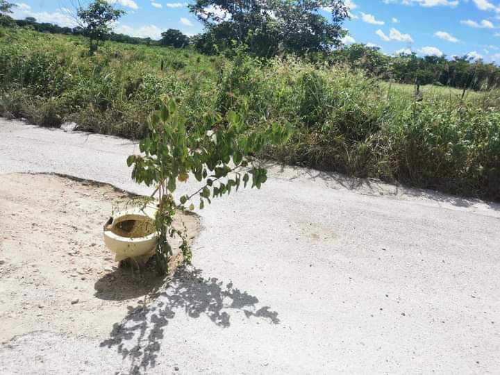 DZILAM GONZÁLEZ, Yucatán, lunes 13/10/21.- Ante la falta de mantenimiento y deterioro en varios puntos de la carretera estatal X’Bec – Dzilam González, algún conductor como protesta le puso un inodoro con una rama a un enorme socavón que casi cubre toda lo ancho de la vía.