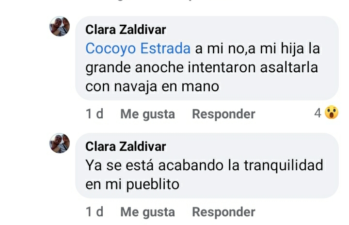 “Ahora resulta q no puedes salir tranquilamente a comprar y te llevas el susto de tu vida. A mí no a mi hija la grande anoche intentaron asaltarla con navaja en mano. Ya se está acabando la tranquilidad en mi pueblo”, escribio la madre de la menor en sus redes sociales.