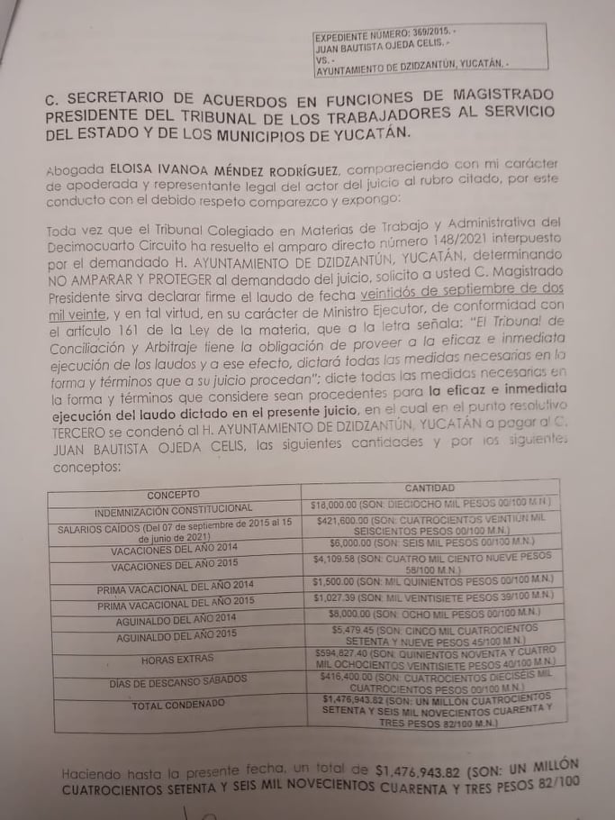 La licenciada Ligia Linda a quien el alcalde Ismael Aguilar Puc le dio el poder para ostentarse como apoderada legal del ayuntamiento, quien en su uso de la palabra dijo que no cuenta con los recursos para pagar y que tampoco se encuentra en esos momentos ninguna autoridad competente del ayuntamiento de Dzidzantún, para atender el requerimiento.