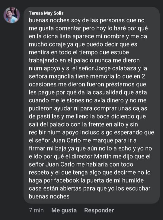 “Es una mentira todo el tiempo que estuve trabajando en el palacio nunca me dieron ningún apoyo, si el señor Jorge calabaza y la señora magnolia tienen memoria lo que en 2 ocasiones me dieron fueron prestamos que les pague por que da la casualidad que hasta cuando me lastime no avía dinero y no me pudieron ayudar ni para una caja de Pastillas “, escribió en sus redes sociales la afectada quien negó que recibió dinero como apoyo a personas de escasos recursos.