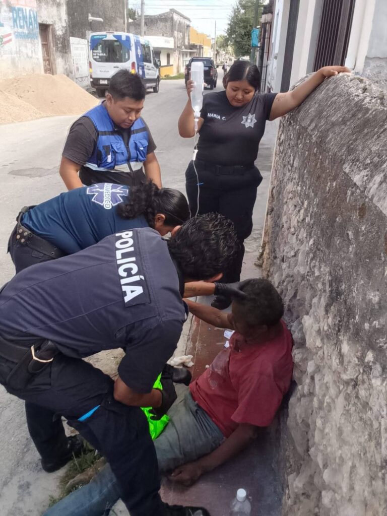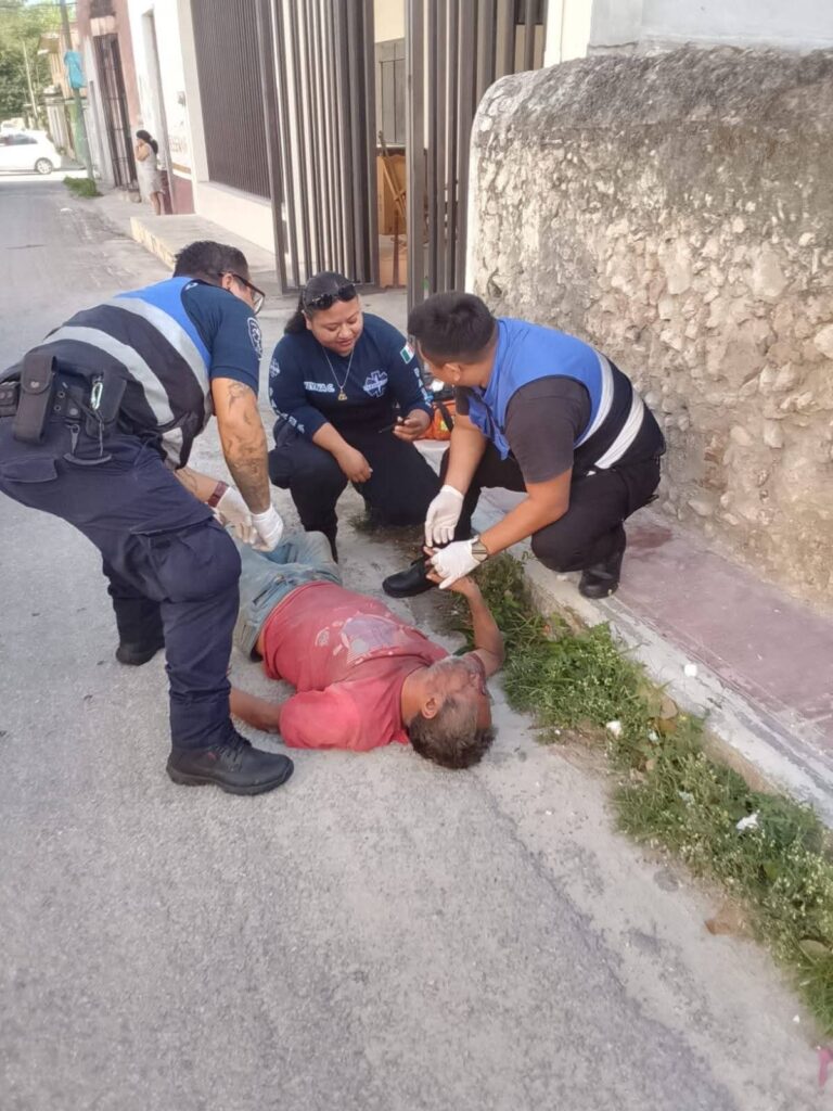 TIXKOKOB, Yucatán, miércoles 18/03/2026.- Paramédicos municipales ayer martes trasladaron a una clínica a un hombre conocido en el pueblo como el “Tío” o “Padrino”, luego que comenzó a convulsionar, se desplomó y cayó al duro pavimento.