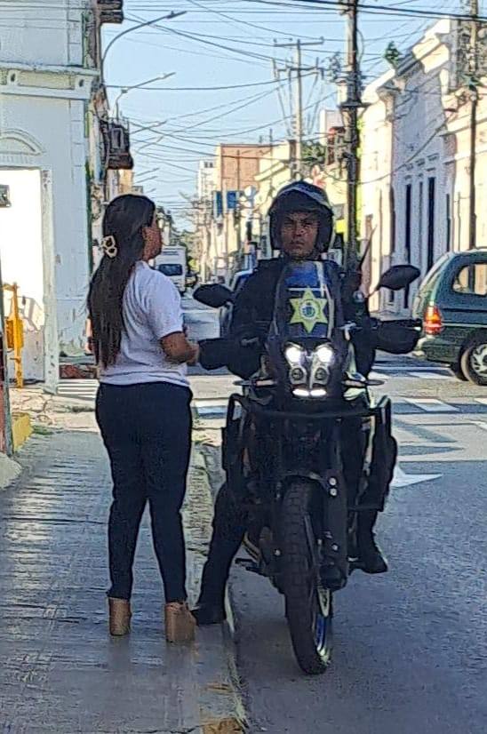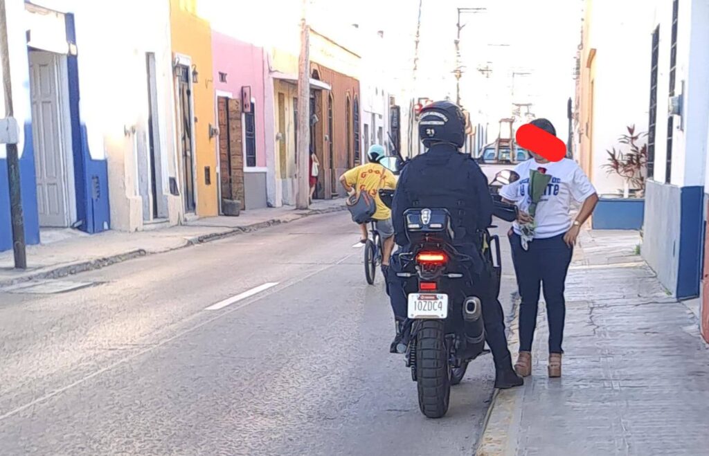 MÉRIDA, Yucatán, jueves 16/04/2026.- Entre lo moral, el romanticismo y el deber policiaco, lo que está bien y no, un policía motorizado de Mérida lo captaron cuando muy “Tolete” en horas de trabajo cortejaba a una joven a la que le dio cariñitos y un ramo de flores.