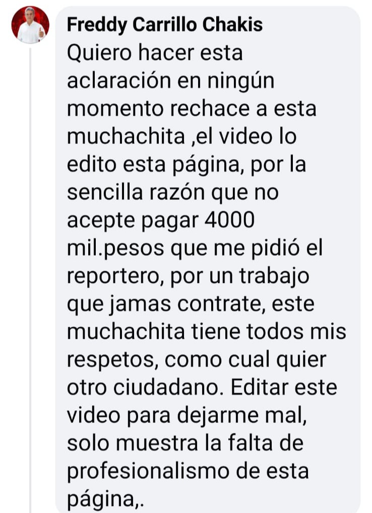 Ante los ataques cibernéticos el actual alcalde de Tzucacab Fredy Carrillo Blanco se defendió y público que el video que circula en las redes sociales donde se le ve que empuja a una jovencitas de escasos recursos, fue editado ya que no le pago un soborno de 4000 pesos al reportero de dicho medio.