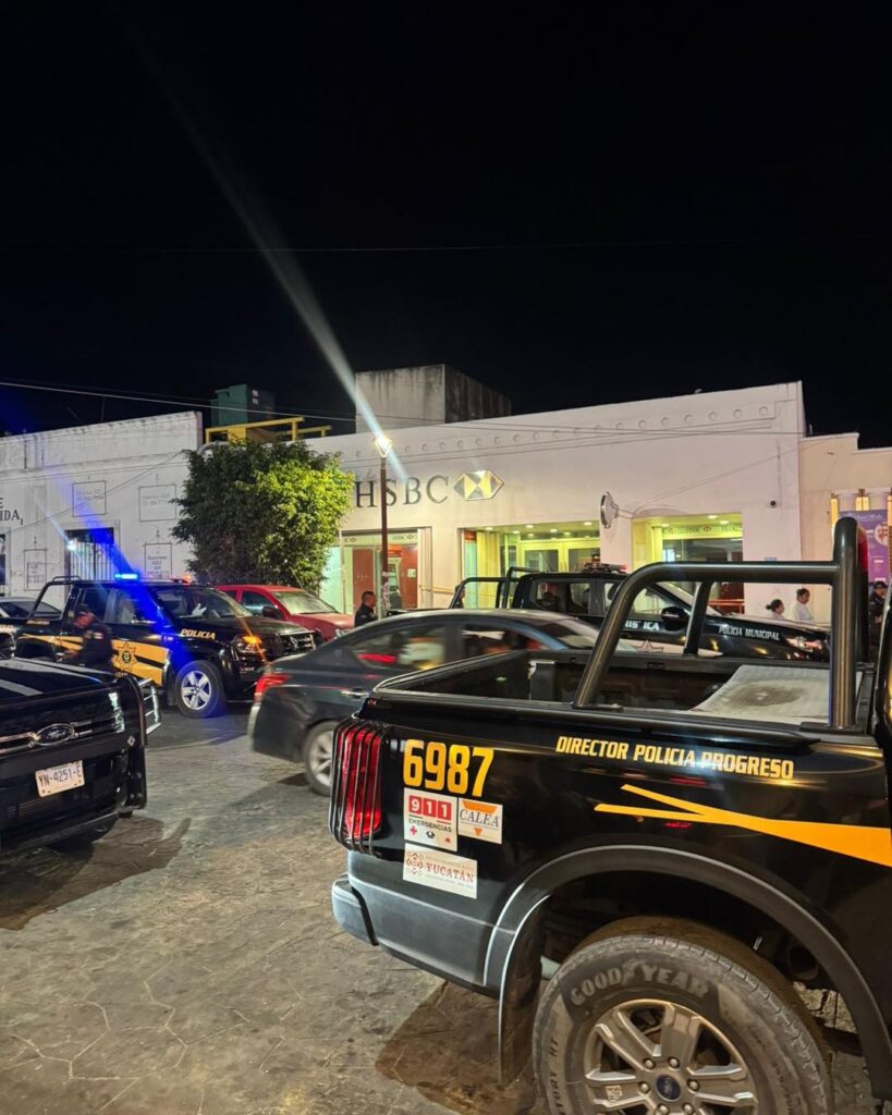 PROGRESO, Yucatán, jueves 12/02/2026.- La noche de este jueves se desplego un fuerte operativo policiaco, luego que un sujeto robo en una sucursal bancaria HSBC ubicada en la calle 80 entre 29 y 31 en el centro del puerto de Progreso.