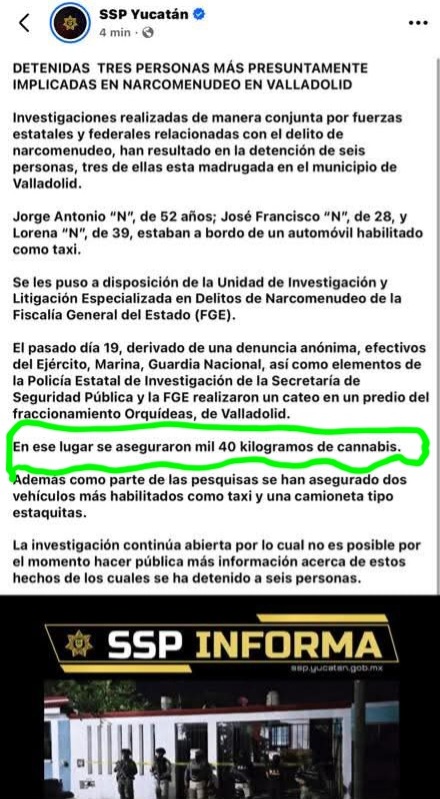 Minutos después la SSP de Yucatán borró y modifico el boletín, le quito que se le aseguró una tonelada 40 kilos de cannabis, luego que la Fiscalía General De La República (FGR) inició con una investigación por delitos contra la salud, por la cantidad de droga que la SSP aseguro.