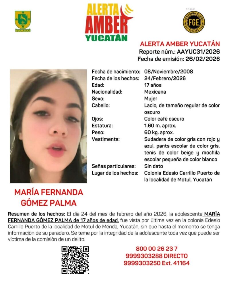 MOTUL, Yucatán, viernes 27/02/2026.- La Fiscalía General del Estado (FGE) activó de una Alerta Amber AAYUC31/2026, para la búsqueda y localización de la menor María Fernanda Gómez P. de 17 años de edad, desparecida el 24 de febrero de 2026, en Motul Yucatán.