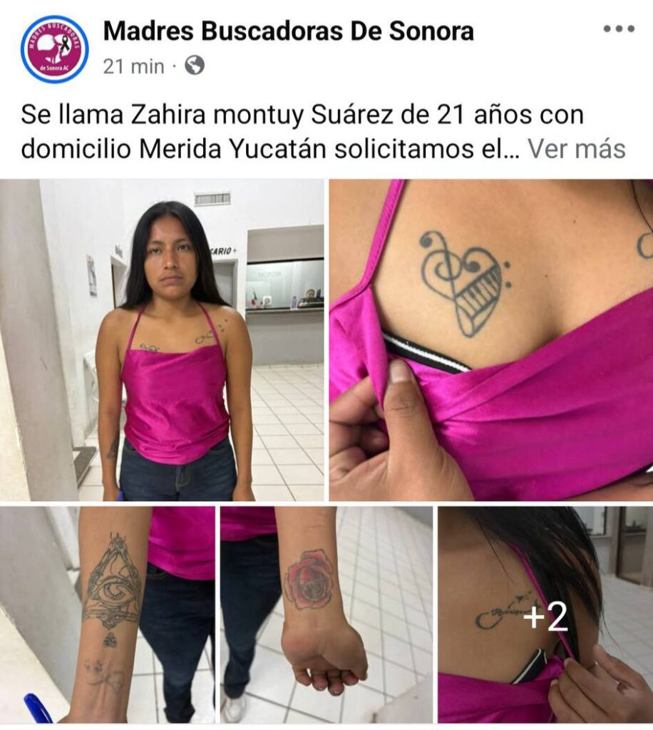 MÉRIDA, Yucatán, miércoles 08/04/2026.- El grupo Madres Buscadoras de Sonora halló en la ciudad de Obregón a la joven Zahira Montuy Suárez de 21 años de edad, oriunda de Mérida, Yucatán, de modo que a través de sus redes sociales pidió ayuda para localizar a sus familiares.