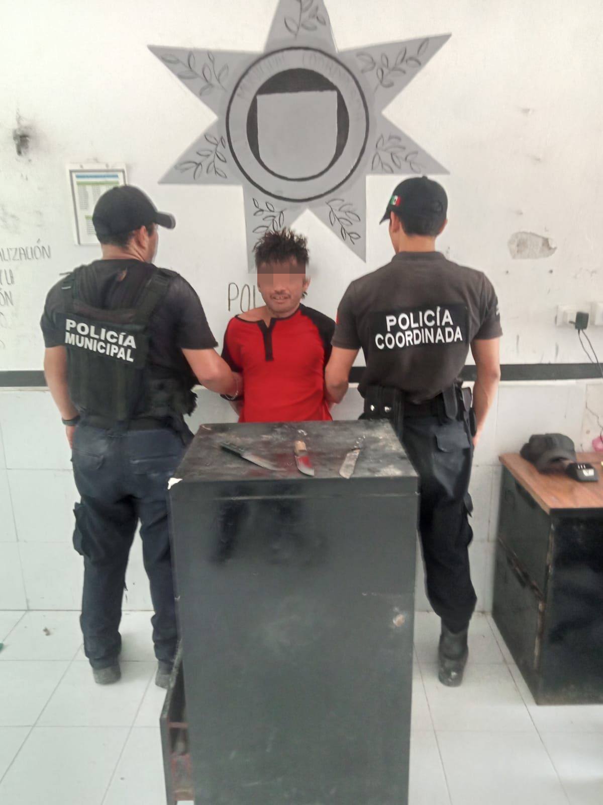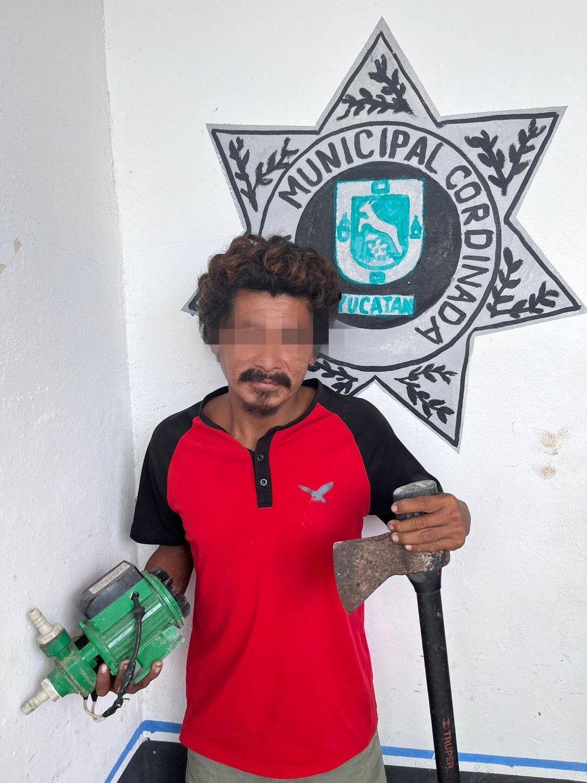 CELESTÚN, Yucatán, martes 14/10/2025.- La policía municipal detuvo este martes a dos sujetos que perecían estar uniformados, uno por entrar a una casa y robar una bomba de agua (motor) y el otro por intentar asalta a una persona con un arma blanca (cuchillos).