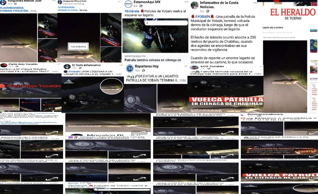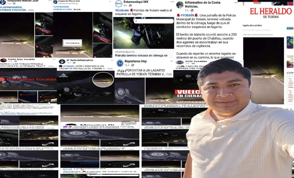 Luego que se hizo público en más de 15 portales de medios de comunicación de Yucatán que no investigaron y aseguraron que policías de Yobaín volcaron una patrulla por esquivar un lagarto volcaron, la mentira se les cayó y quedó al descubierto que la imagen fotográfica del cocodrilo la publico el medio de comunicación del Heraldo de Tuxpan en junio de 2022.
