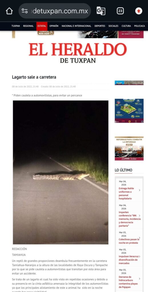 El alcalde Alberto Cool para encubrir a la pareja de policías mando un boletín a sus medios de comunicación pagados y chayoteros donde afirmo que los policías Ángel y Brandon volcaron la patrulla unidad 589 para evitar atropellar un lagarto, pero mando una foto de un cocodrilo que en el año 2022 publico el Heraldo de Tuxpan.
