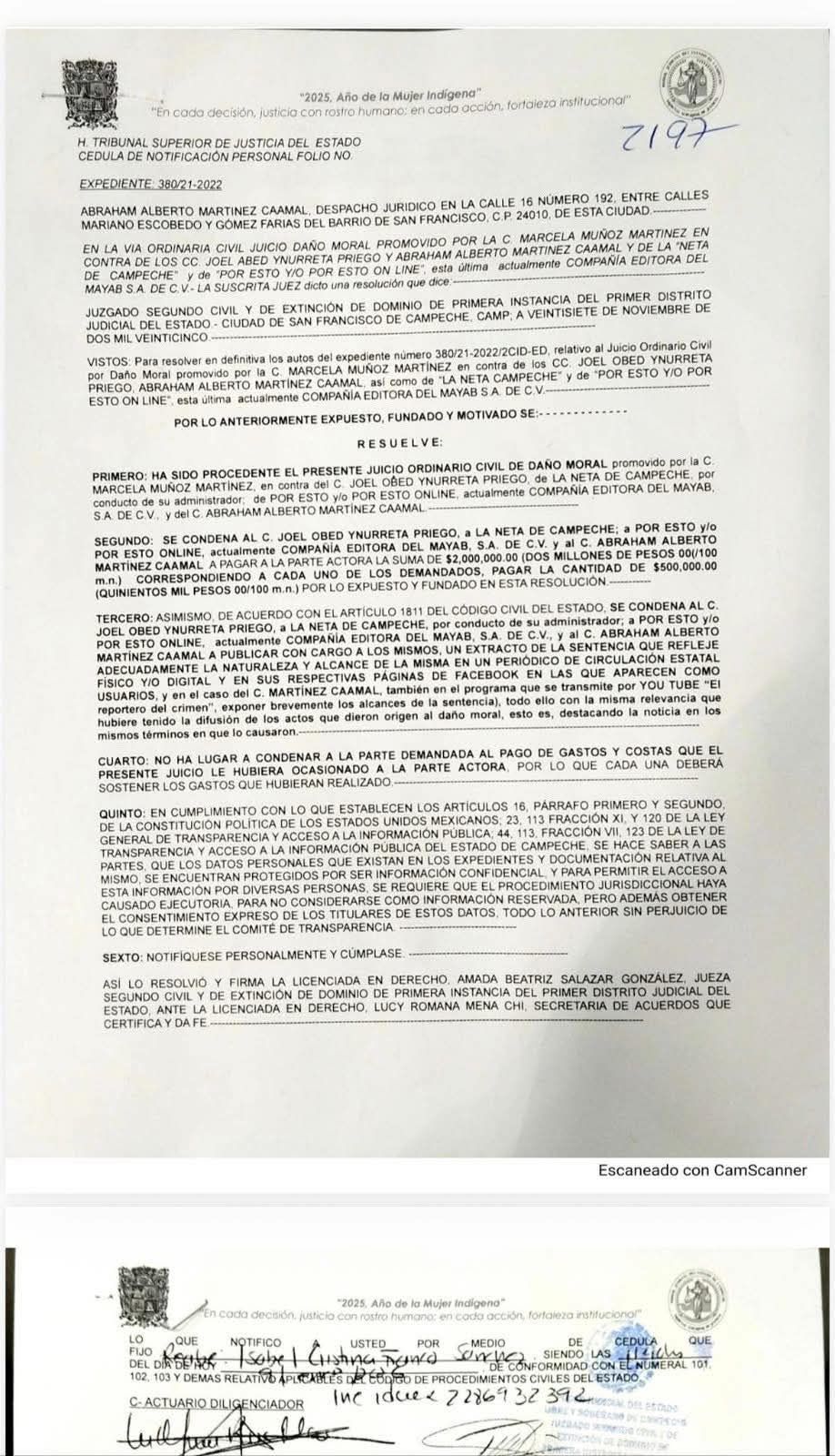 CAMPECHE, sábado 10/01/2026.- Por cuestionar al gobierno campechano y a la titular de la Secretaría de Protección y Seguridad Ciudadana, Marcela Muñoz, un juez sentencio a los periodistas Joel Obed y Abraham Alberto Martínez Caamal; y a los medios digitales de comunicación La Neta de Campeche y Por Esto y/o Por Esto online, a pagar dos millones de pesos.