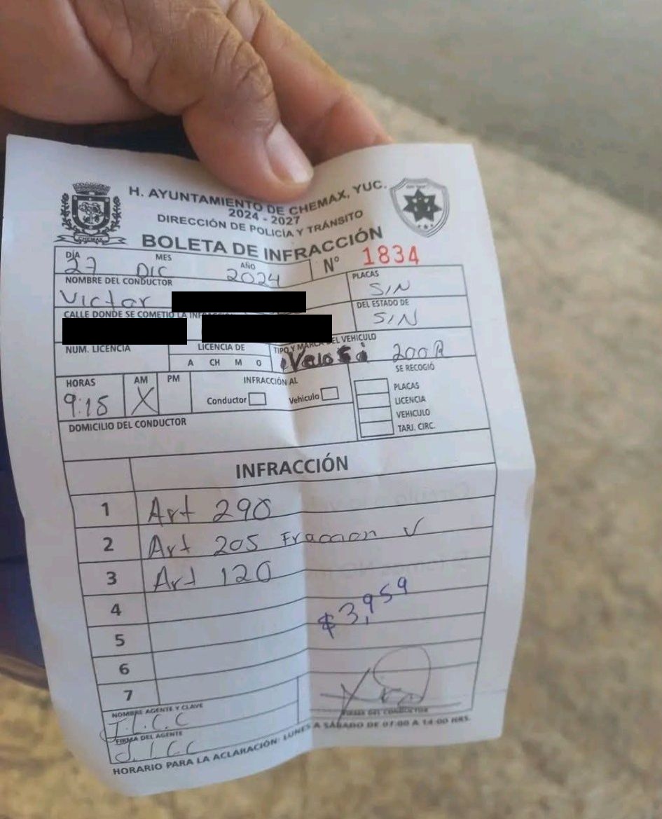 Según una boleta de infracción, los oficiales pusieron que el motorizado violo los artículos 290, 205 y 120 del Reglamento de Tránsito en Chemax, sin embargo, para que las víctimas no reclamen o interpongan algún juicio administrativo, los policías pusieron en la boleta de infracción 27 de diciembre de 2024.