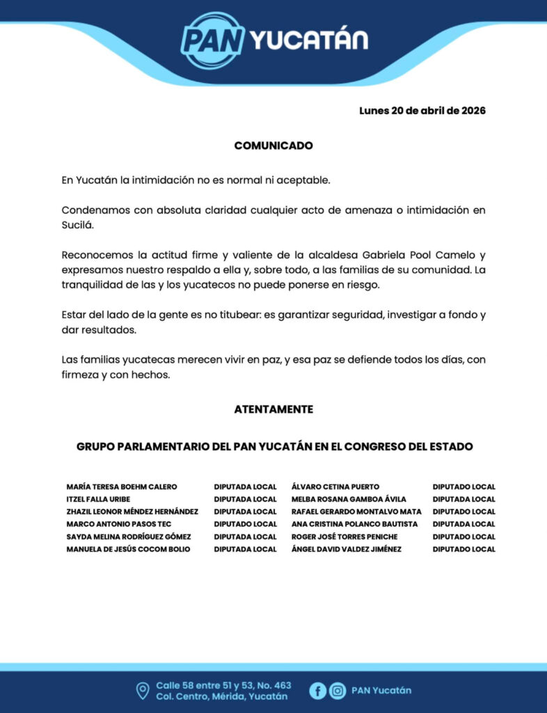 RESPUESTA DEL PAN: Los 12 diputados locales del PAN condenaron esta amenaza e intimidación en Sucilá y, por medio de un comunicado dijeron que en Yucatán la intimidación no es normal ni aceptable.