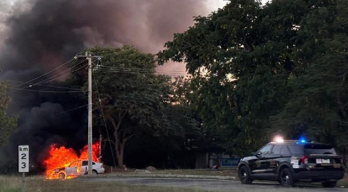 MÉRIDA, Yucatán, lunes 01/12/2025.- Tremendo susto se llevó el conductor de un automóvil que circulaba la tarde de ayer domingo en el Periférico de Mérida, luego que su vehículo se incendió en el kilómetro 23 a la altura de Cotolengo.
