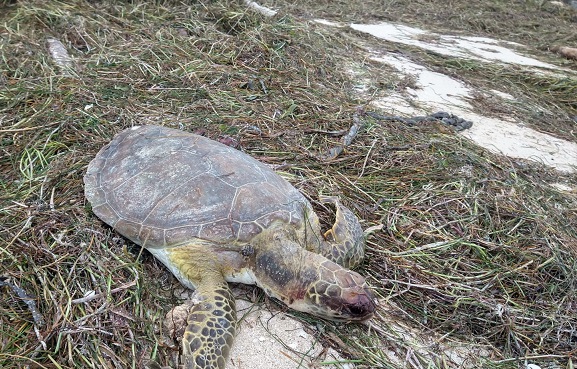 Mas al oriente entre el puerto de Chabihau comisaría de Yobaín y el puerto de Santa Clara comisaria de Dzidzantún apareció muerta una tortuga de carey en la playa, con señales de violencia, al parecer la mataron de un trancazo en la cabeza, luego la destriparon y la abandonaron en la playa.