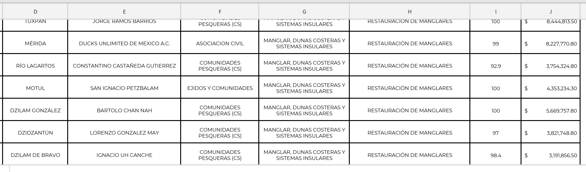 La ciudad de Mérida a través de una Asociación Civil recibió de la Comisión Nacional Forestal (Conafor) $8, millones 227mil 770 pesos del programa federal reforestación de manglares, mientras que la ciudad de Motul San Ignacio Petzbalam recibió $4 millones 353 mil 234 pesos.
