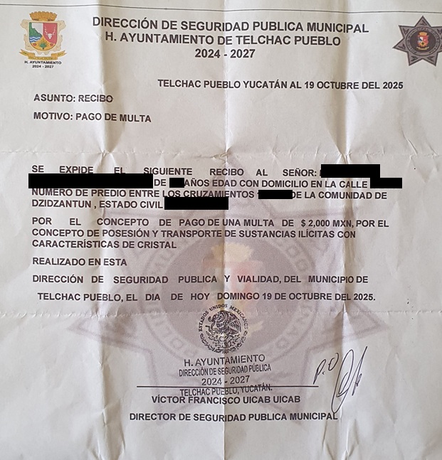 Aunque el caso se trató de guardar por que el alcalde de Dzidzantún Ángel “Apin” devolvió el dinero, de manera extra oficial se filtro un recibo de pago donde a un ciudadano al que detuvieron en el municipio de Dzidzantún tuvo que pagar 2,000 pesos de multa en Telchac Pueblo, luego que policías de la Secretaría De Seguridad Pública (SSP) lo detuvo y traslado a Telchac.