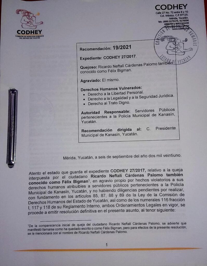 KANASÍN, Yucatán, lunes 06/09/21.- Después de cinco años la Comisión de Derechos humanos del Estado de Yucatán emitió la recomendación 19/2021 derivada del expediente CODHEY 27/2017, como reparación de daños por las agresiones que recibió el periodistas y director del portal informativo “La noticia Ciudadana”.