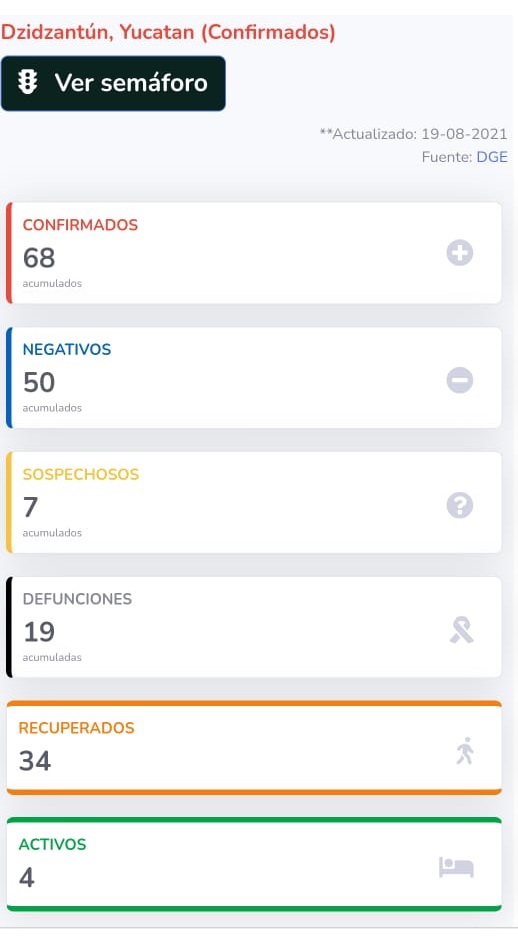 Según la última actualización Covid en Dzidzantún se tienen reportado 128 casos de los cuales 68 dieron positivo, 7 sospechosos, 50 negativos, 19 muertos y 4 casos activos.