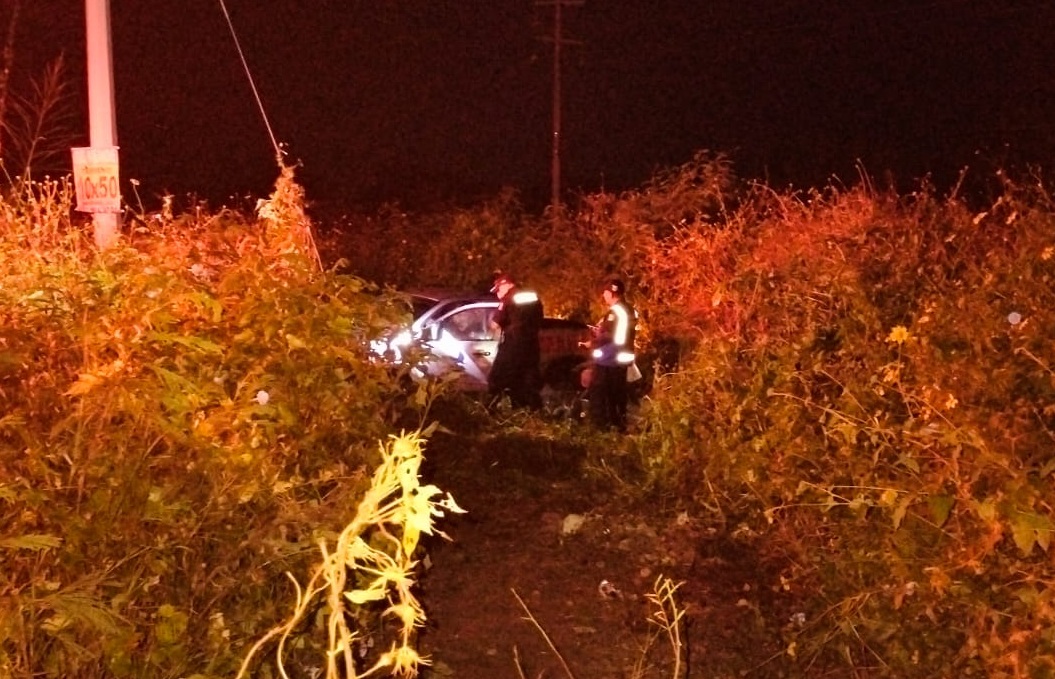 MOTUL, Yucatán, martes 04/11/2025.- El conductor de una camioneta Tornado la noche de este martes se salvó que la huesuda se lo lleve al más allá, luego que chocó contra la base metálica de las cámaras de seguridad de la SSP y salió de la carretera a la altura de la maquiladora Monty.