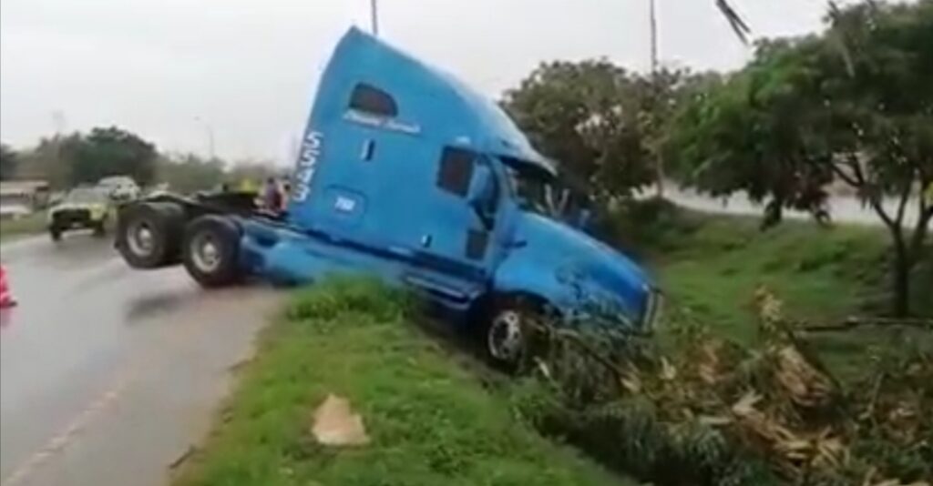 MÉRIDA, Yucatán, sábado 12/06/21.- A causa de la intensa lluvia y el pavimento mojado este sábado por la tarde un tráiler patinó y casi cayó dentro de una hondonada cuando circulaba a la altura del kilómetro 10, bajando del puente con salida a X´matkuil.