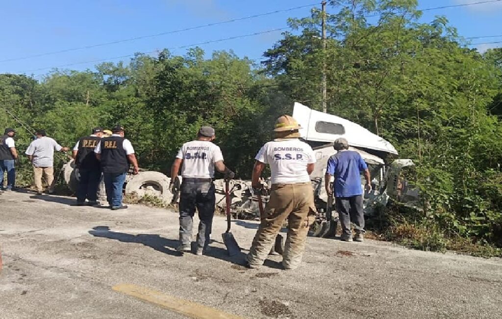 KANTUNIL, Yucatán, miércoles 06/10/21.- Trágica muerte encontró ayer lunes, el chofer de vehículo Nissan Tsuru, de color gris, luego que fue chocado y arrastrado por un tráiler cargado con bultos de cemento, en la carretera federal libre Mérida –Cancún.