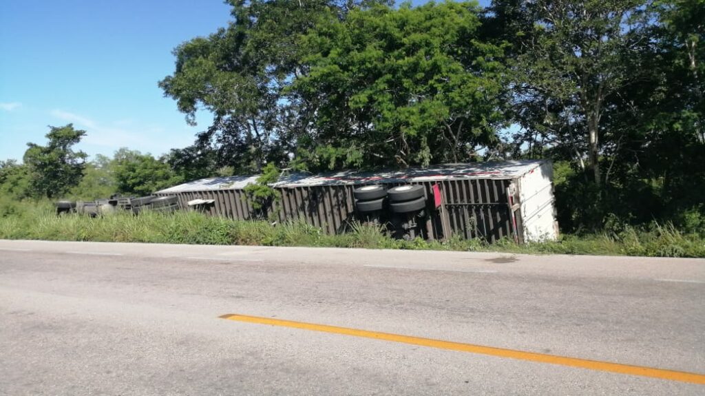 Según información el tráilero circulaba de oriente a poniente sobre la vía federal antes mencionada, pero al llegar al kilómetro 60.5, a la altura del libramiento Cansahcab, dormito, perdió el control de su pesada unidad con placas de circulación 43TX8W y termino volcado de su lado derecho dentro de la maleza.
