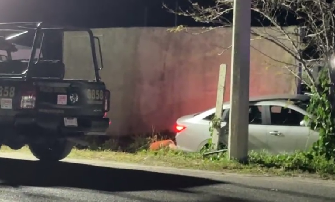 PROGRESO, Yucatán, lunes 20/10/2025.- El conductor de un vehículo Chevrolet Aveo y su acompañante, la noche de ayer domingo se encandiló con la luz de un reflector y chocó contra un retén de la Secretaría de Seguridad Pública (SSP) instalado bajando del puente que conecta a Yucalpetén con el puerto de Progreso.