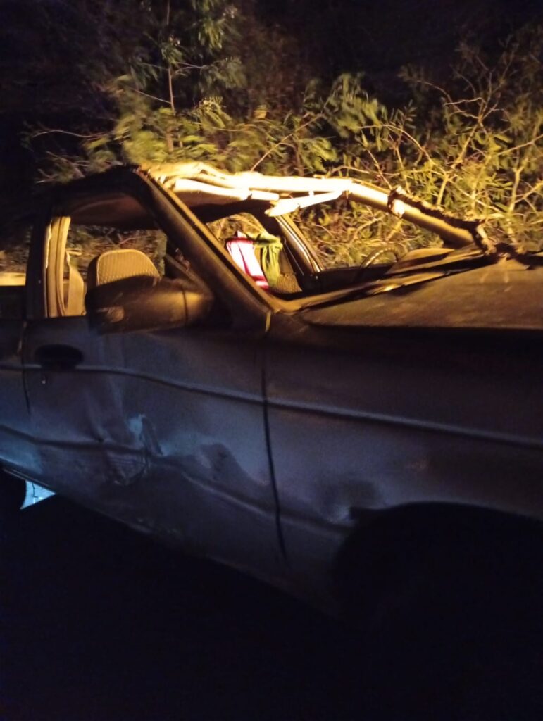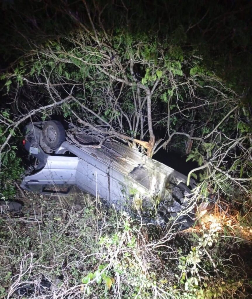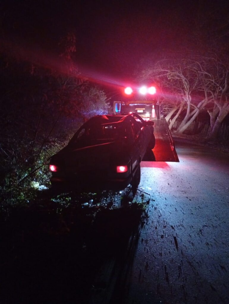 El vehículo quedo volcado con las llantas hacia arriba y con las luces encendida, testigos dijeron que el conductor circulaba a exceso de velocidad, al tomar una curva en el kilómetro 10 a la altura donde está una bomba de agua potable, perdió el control, salió de la carretera y volcó.