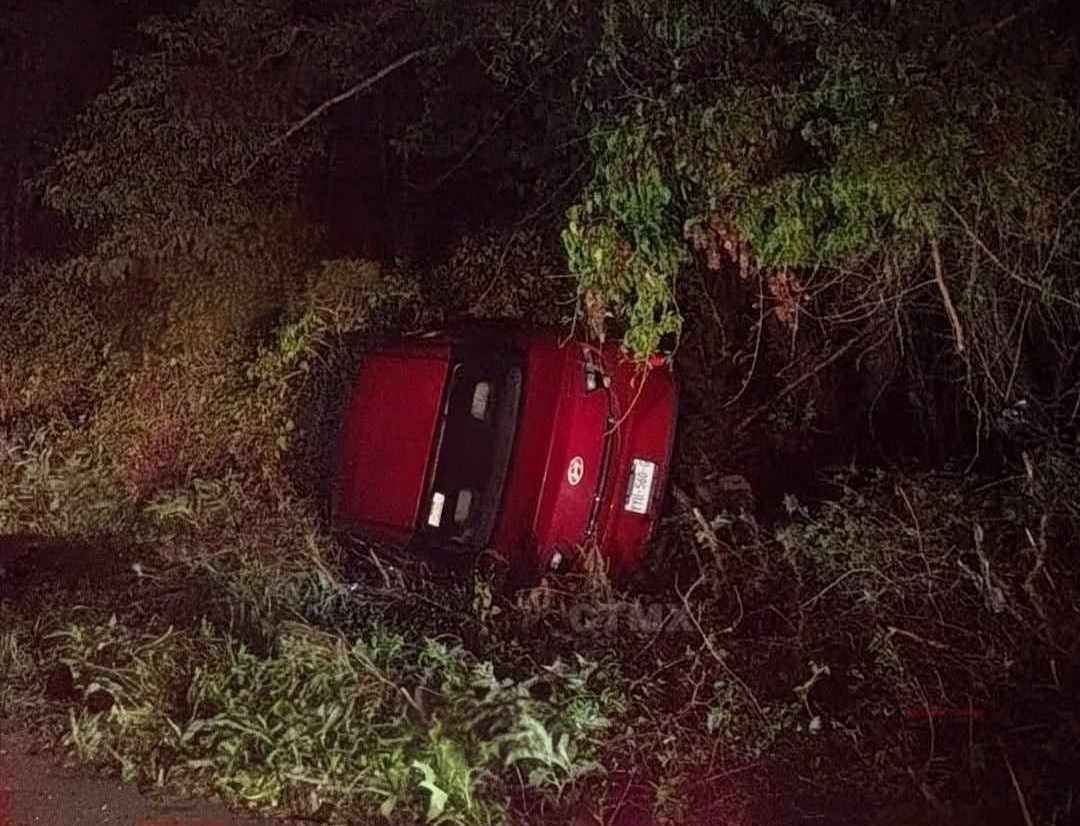 TEMAX, Yucatán, viernes 12/12/2025.- El conductor de un automóvil Hyundai Grand de color rojo quien iba acompañado de una mujer se llevó el susto de su vida, luego que dormito al volante y salió de la carretera a la altura de Chenche de las Torres en la carretera federal Cansahcab- Temax.