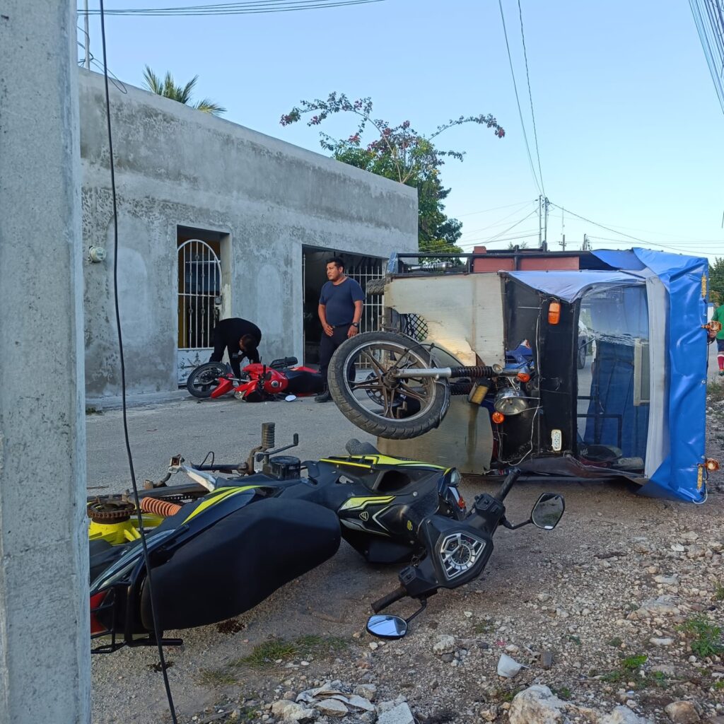 DZIDZANTÚN, Yucatán, miércoles 08/04/2026.- El conductor de un mototaxi la tarde de este miércoles terminó volcado luego que chocó contra una motocicleta Honda de color rojo estacionada y contra una moto Italika At 125c.c. que circulaba sobre la calle 23 entre 22 y 24.