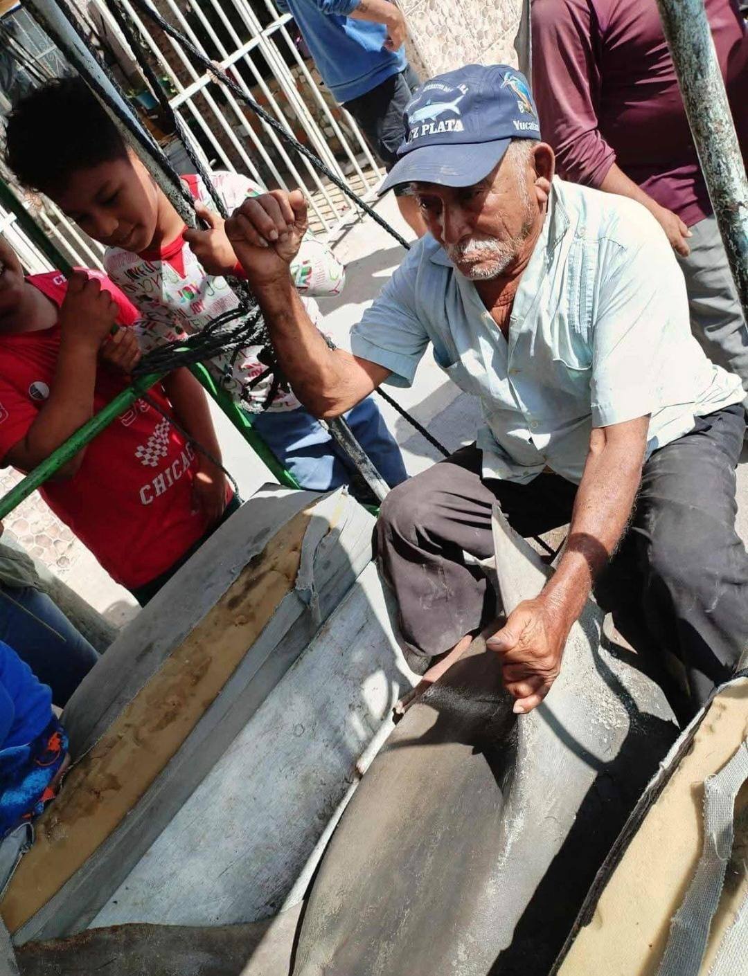 CELESTÚN, Yucatán, domingo 18/01/2026.- Un veterano pescador la mañana de ayer sábado capturó en la ría del puerto de Celestún un tiburón gris, perteneciente a la familia Carcharhinidae, de más de dos metros de largo y más de 100 kilogramos de peso.