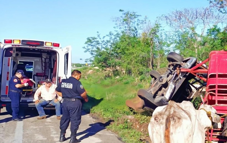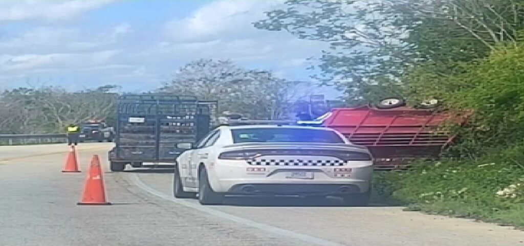 Una camioneta con remolque, vuelca con tres toros en la vía federal Cansahcab- Temax