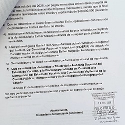 EN CONTEXTO: En la denuncia que se interpuso 16 de octubre de 2025 ante el Congreso del Estado se pide que la diputada María Ester Magadan rinda cuentas y trasparente de donde obtiene más de un millón de pesos que le paga a un banco de manera mensual por un crédito hipotecario por 25 millones de pesos.