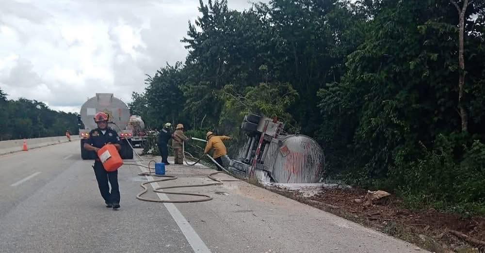 La pipa sufrió una falla mecánica, uno de los remolques se desprendió y volcó sobre su costado derecho en el kilómetro 182, del tramo carretero Sisbichén- Chemax, lo que causo que las autoridades cerraran por motivos de seguridad ambos carriles a la circulación.